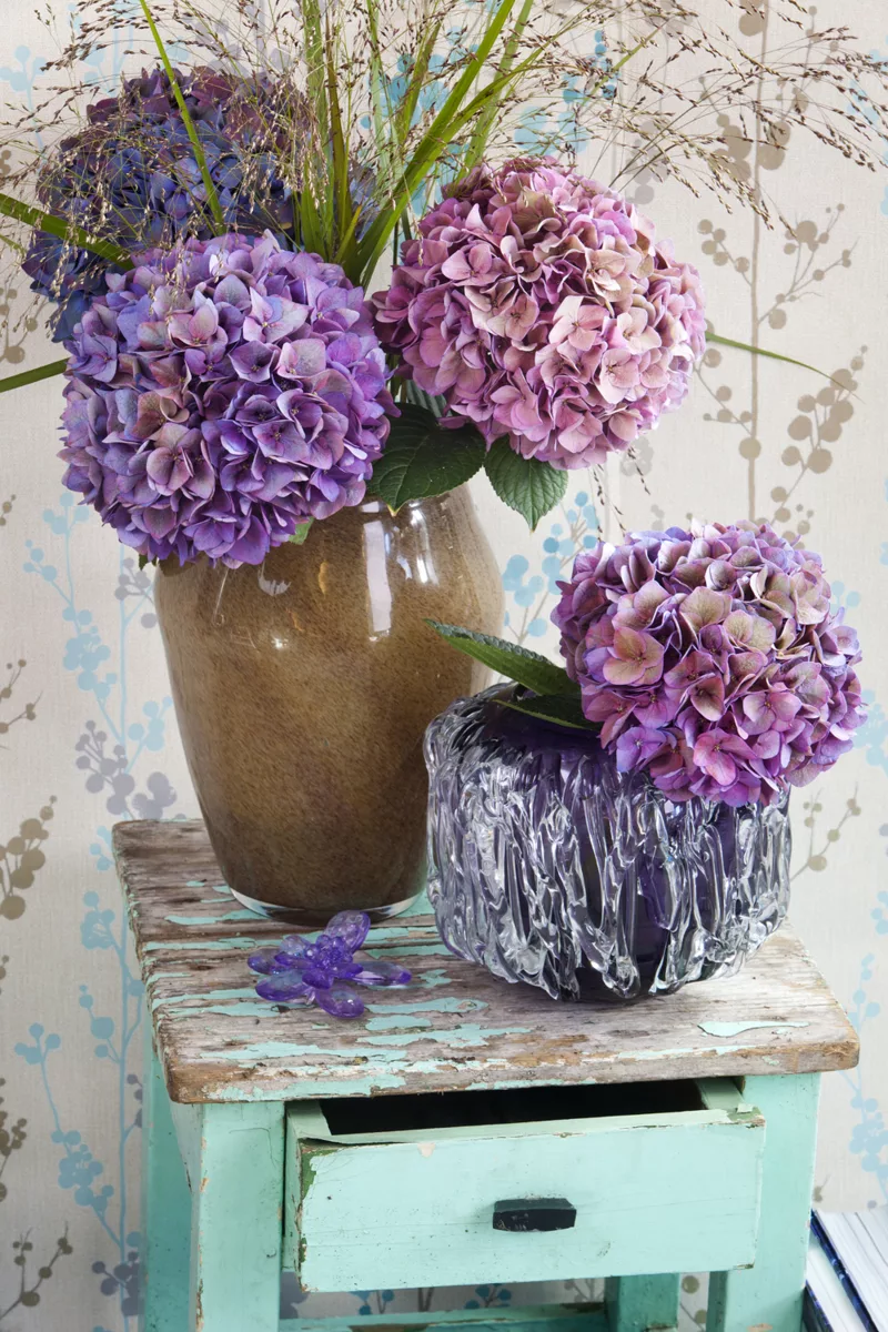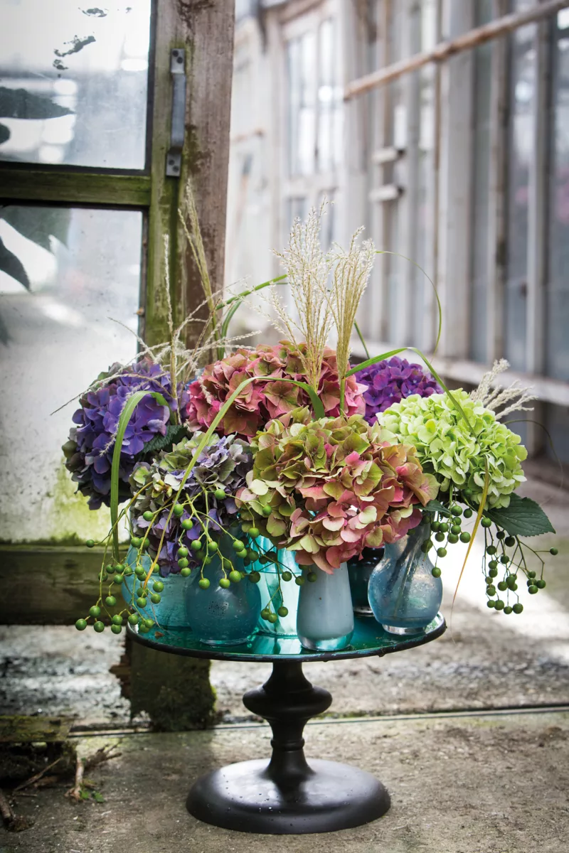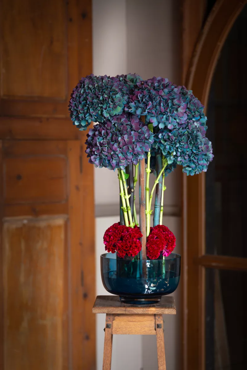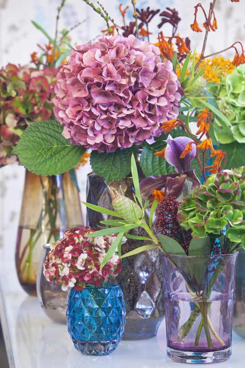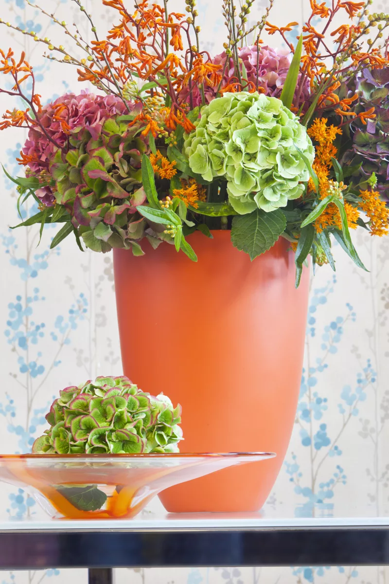 Hortensja cięta typu „Classic” to kwiat, który zachwyca różnorodnością barw i wyjątkową trwałością. W odróżnieniu od odmiany „Fresh”, prezentuje pełniejsze, bardziej dojrzałe piękno. Dzięki temu stała się ulubienicą florystów i dekoratorów, którzy chętnie sięgają po nią tworząc sezonowe bukiety i aranżacje. Po zmianie koloru hortensje „Classic” dostępne są w okresie od czerwca do końca lutego. Oto kilka propozycji zastosowania niezwykle malowniczej hortensji typu „Classic” w jesiennych kompozycjach do wnętrz.