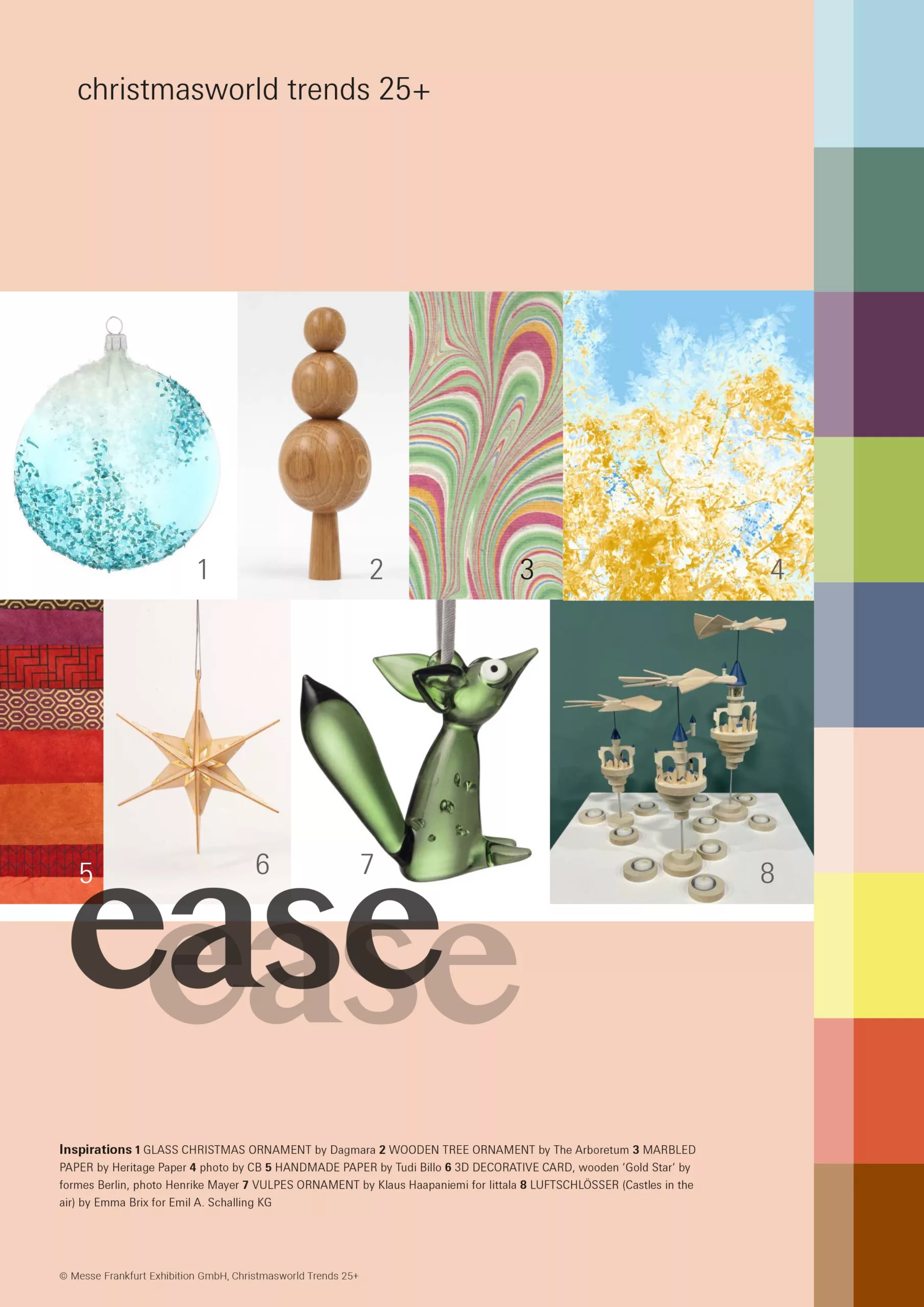 „Trzy trendy – głęboki, realistyczny i swobodny – mają wspólny mianownik: odpowiedzialność i zjednoczenie z naturą oraz optymistyczne patrzenie w przyszłość. Te idee nadają szczególnego znaczenia świątecznemu nastrojowi i znajdują odbicie w kreatywnych pomysłach, rękodziele i nowych materiałach” – zauważa Annetta Palmisano, ekspertka ds. trendów w Stilbüro bora.herke.palmisano, współautorka kolekcji trendów Christmasworld.