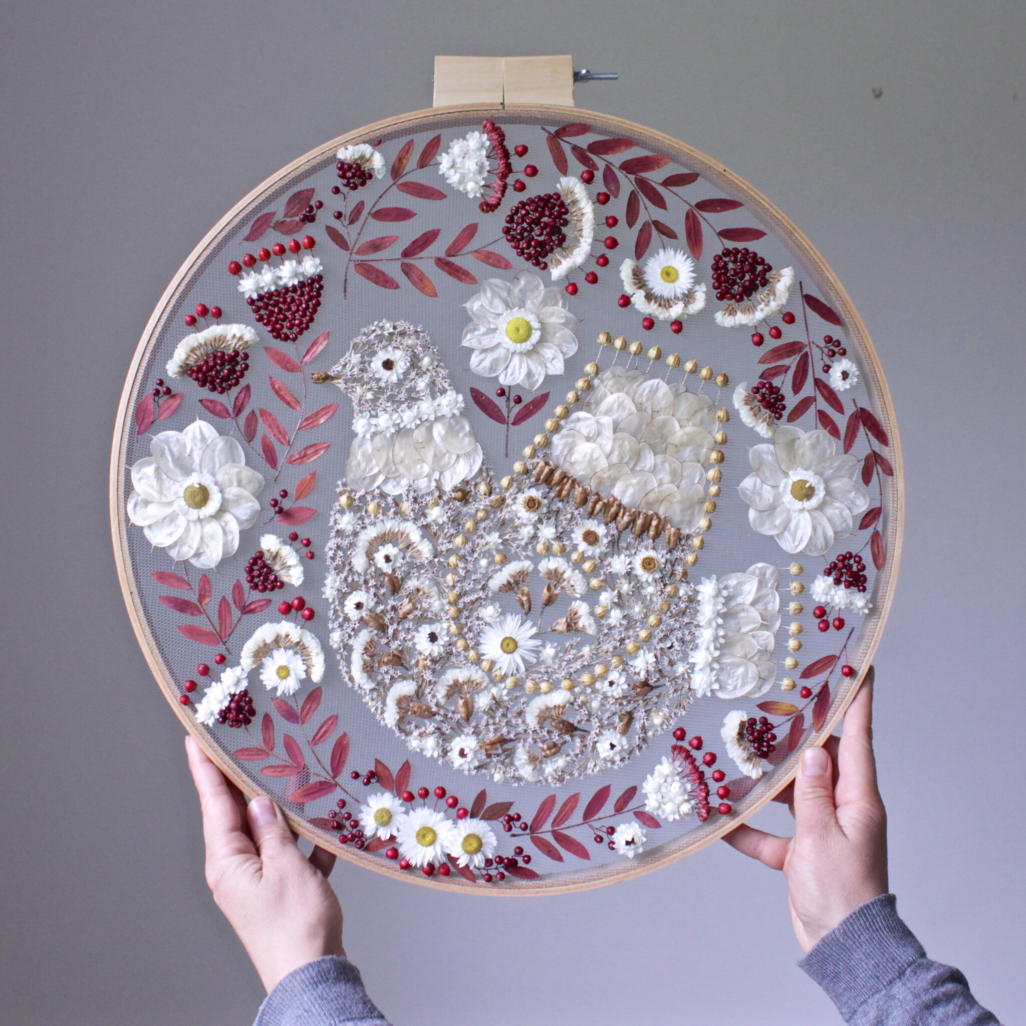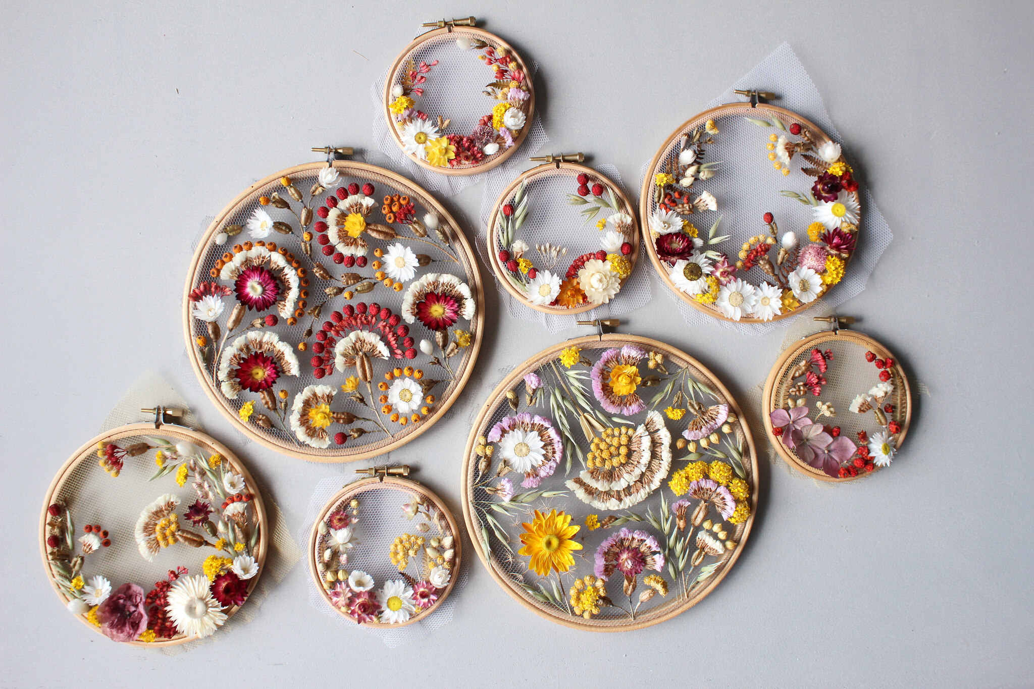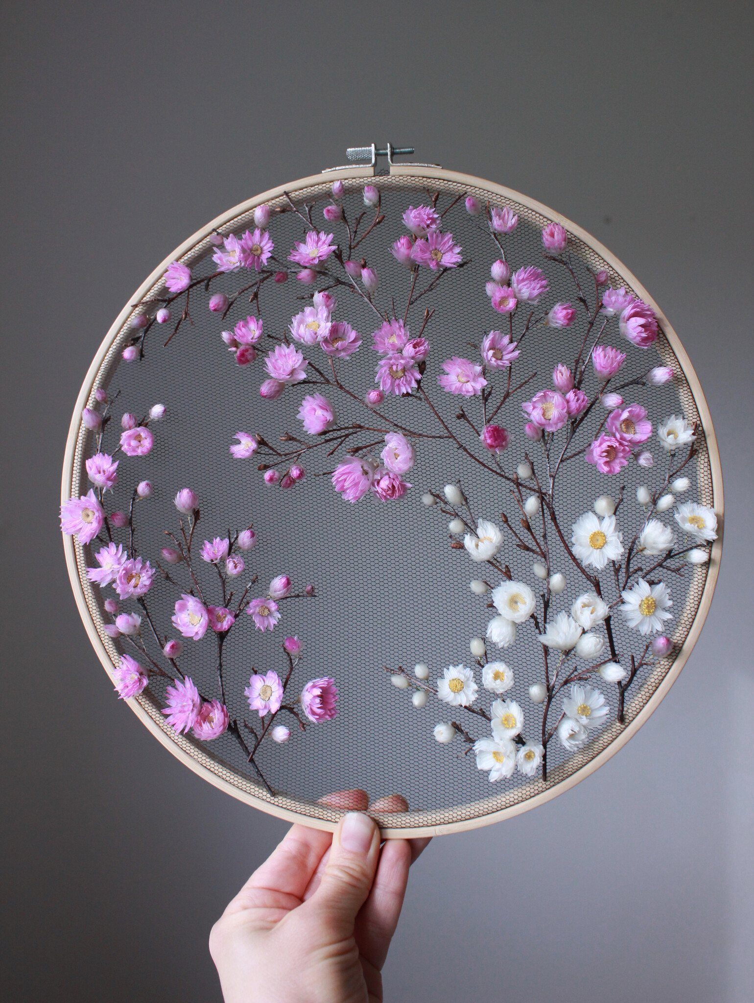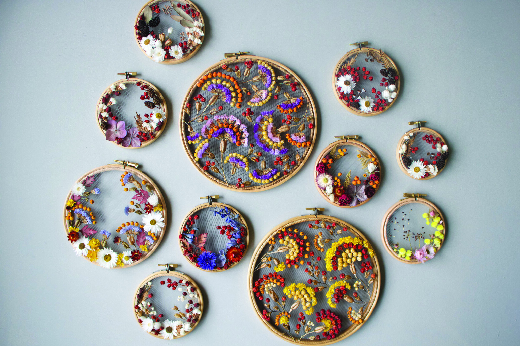 Stosuję różne metody mocowania kwiatów, ale głównie sprowadza się to do tego, że unieruchamiam delikatne łodyżki w siateczkowej strukturze tkaniny. Niektóre łodyżki mają zaledwie ćwierć milimetra szerokości. To skomplikowany proces, który wymaga sporego zaangażowania i maksymalnego skupienia oraz wyczucia punktu krytycznego delikatnych surowców w moich opuszkach palców. Często mam wrażenie, że kierują mną same rośliny, ponieważ na ogół improwizuję rozprowadzając delikatny kwiatowy wzór w ramce tamborka – tłumaczy rękodzielniczka.