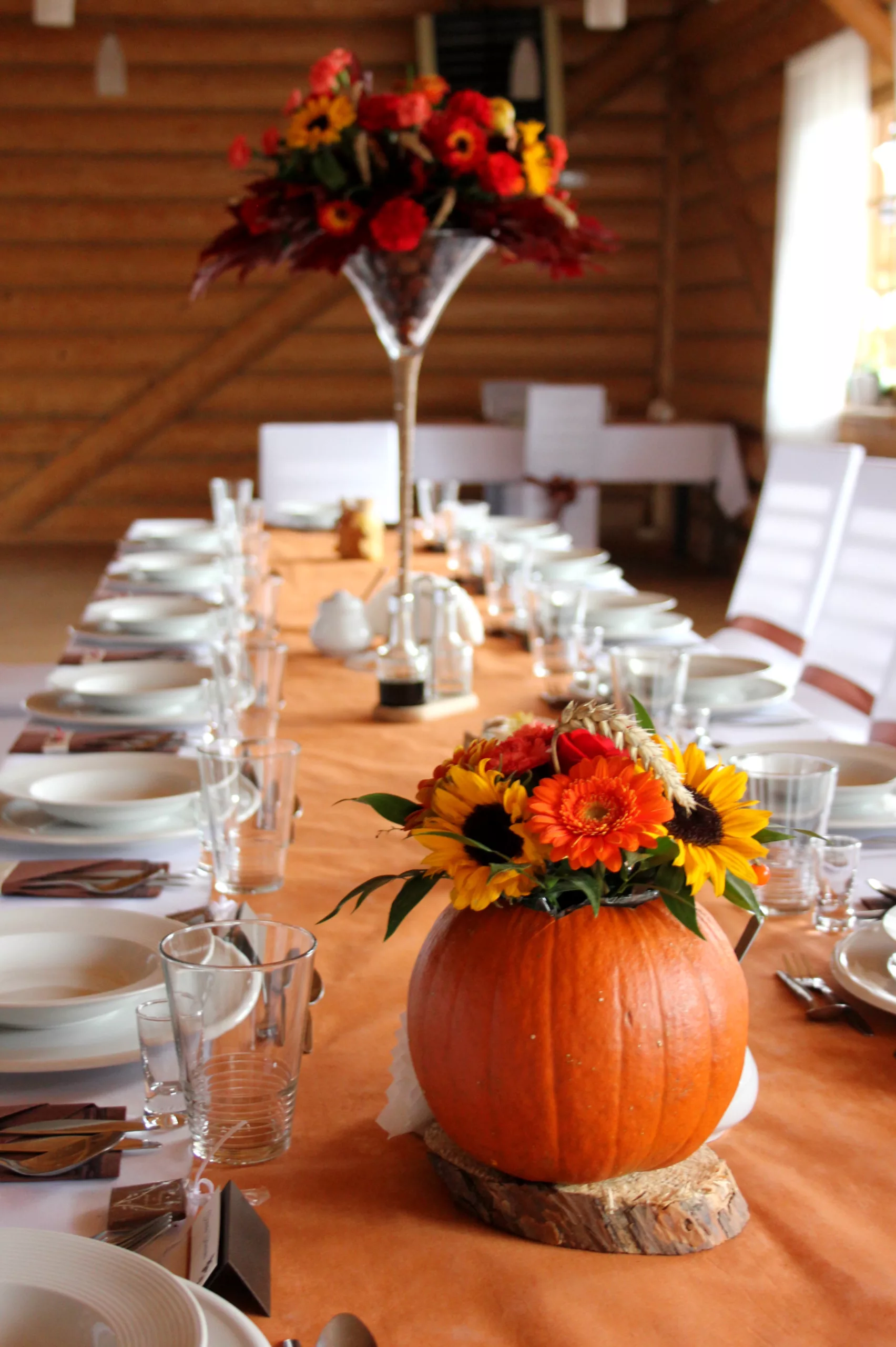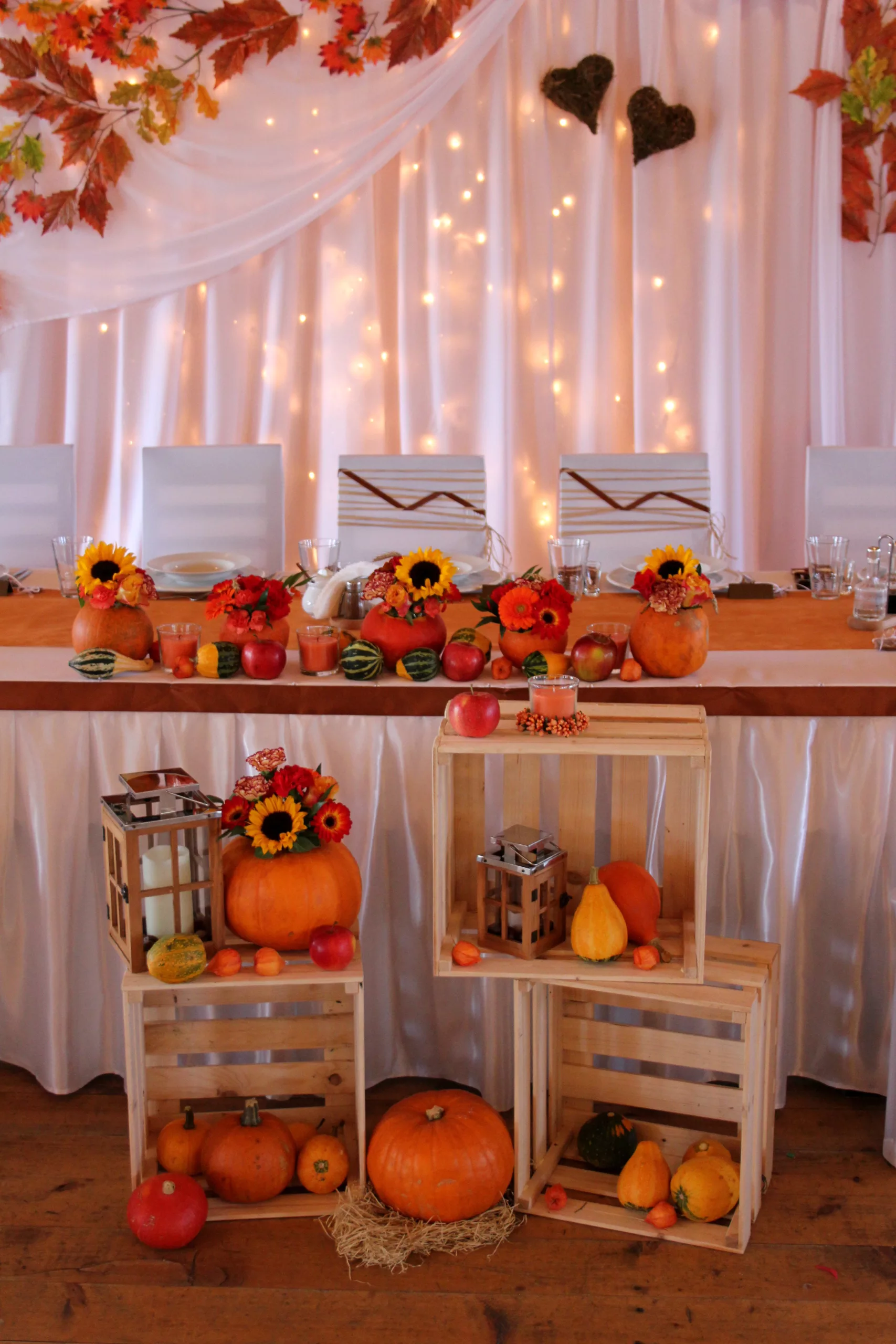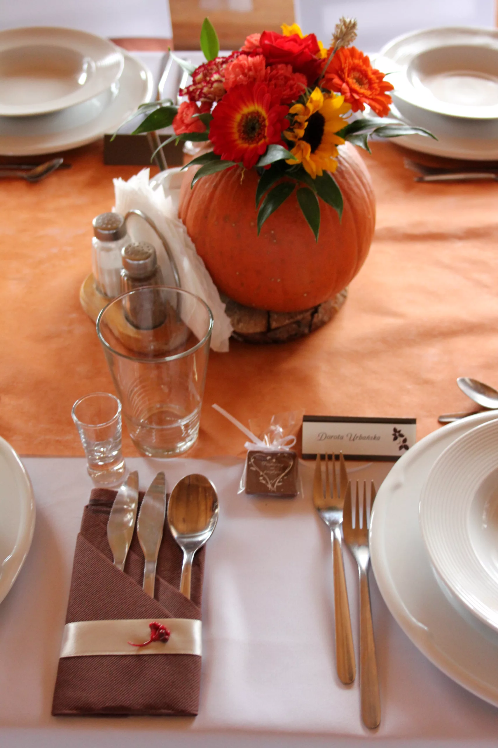 Dynie ozdobne to niezwykle wdzięczny materiał. Niedrogi, łatwo dostępny i uniwersalny. Odpowiednio zestawione z jesiennymi kwiatami, świecami i naturalnymi tkaninami potrafią stworzyć niezapomniany nastrój. Jeśli narzeczeni marzą o weselu pełnym ciepła, kolorów i natury, dekoracje z dyniami to strzał w dziesiątkę! Uroczo wyglądają w towarzystwie suszonych kwiatów, wrzosów, drewna i naturalnej zieleni. Wspaniale prezentują się jako główna dekoracja stołów weselnych, ale też na parapetach, komodach, bufetach i zabytkowych piecach.
