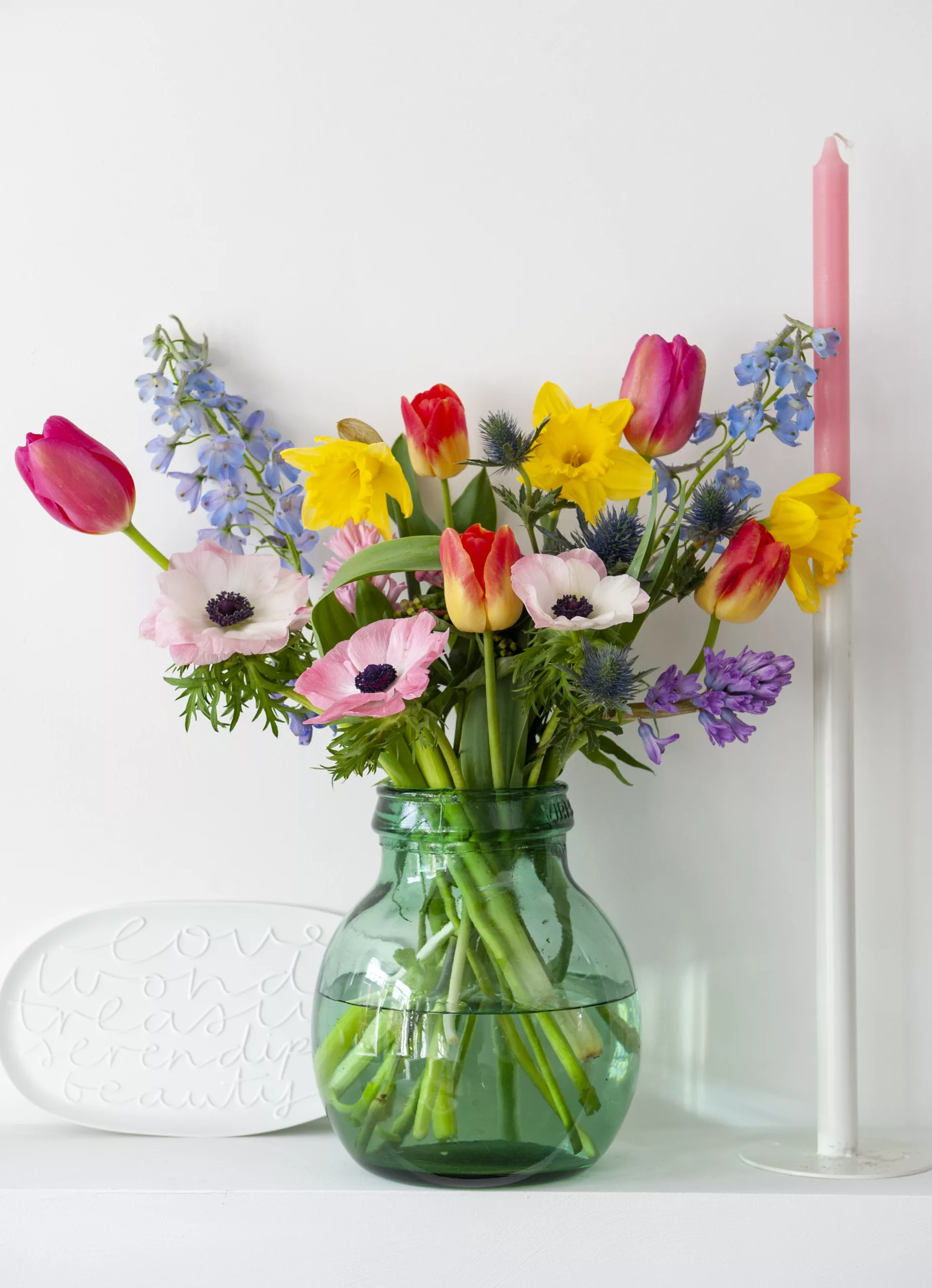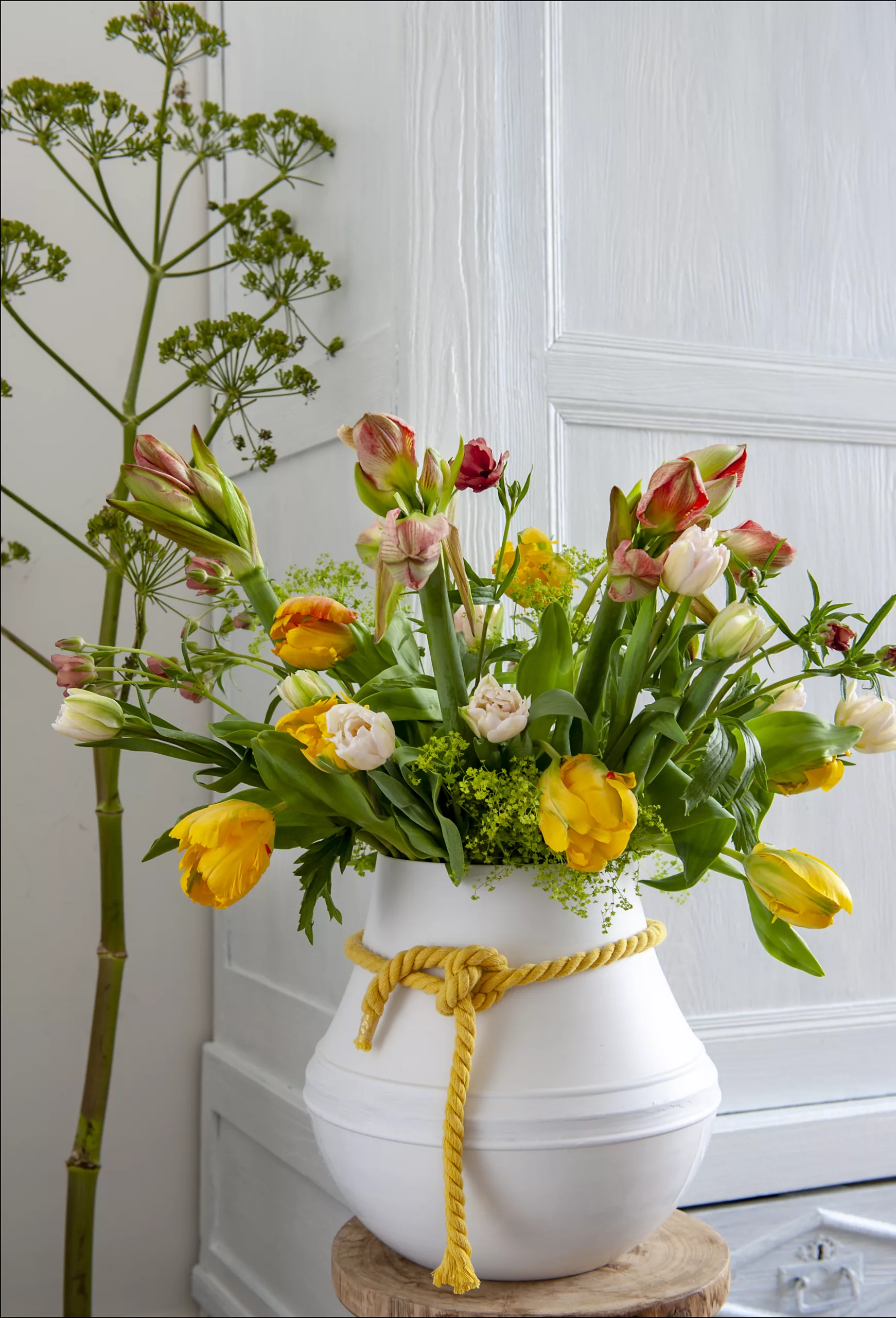 Nie ma Wielkanocy bez tulipanów, które od wieków symbolizują odrodzenie i nowy początek. Ich prosta, smukła forma sprawia, że pasują zarówno do rustykalnych, jak i nowoczesnych aranżacji. To klasyka wiosennego stołu. Białe tulipany podkreślają duchowy wymiar świąt, żółte wnoszą radość i energię, a różowe dodają lekkości. Warto pamiętać, że tulipany „pracują” w wazonie, delikatnie wyginając się ku światłu, dzięki czemu kompozycja z dnia na dzień zmienia się i nabiera naturalnej dynamiki.