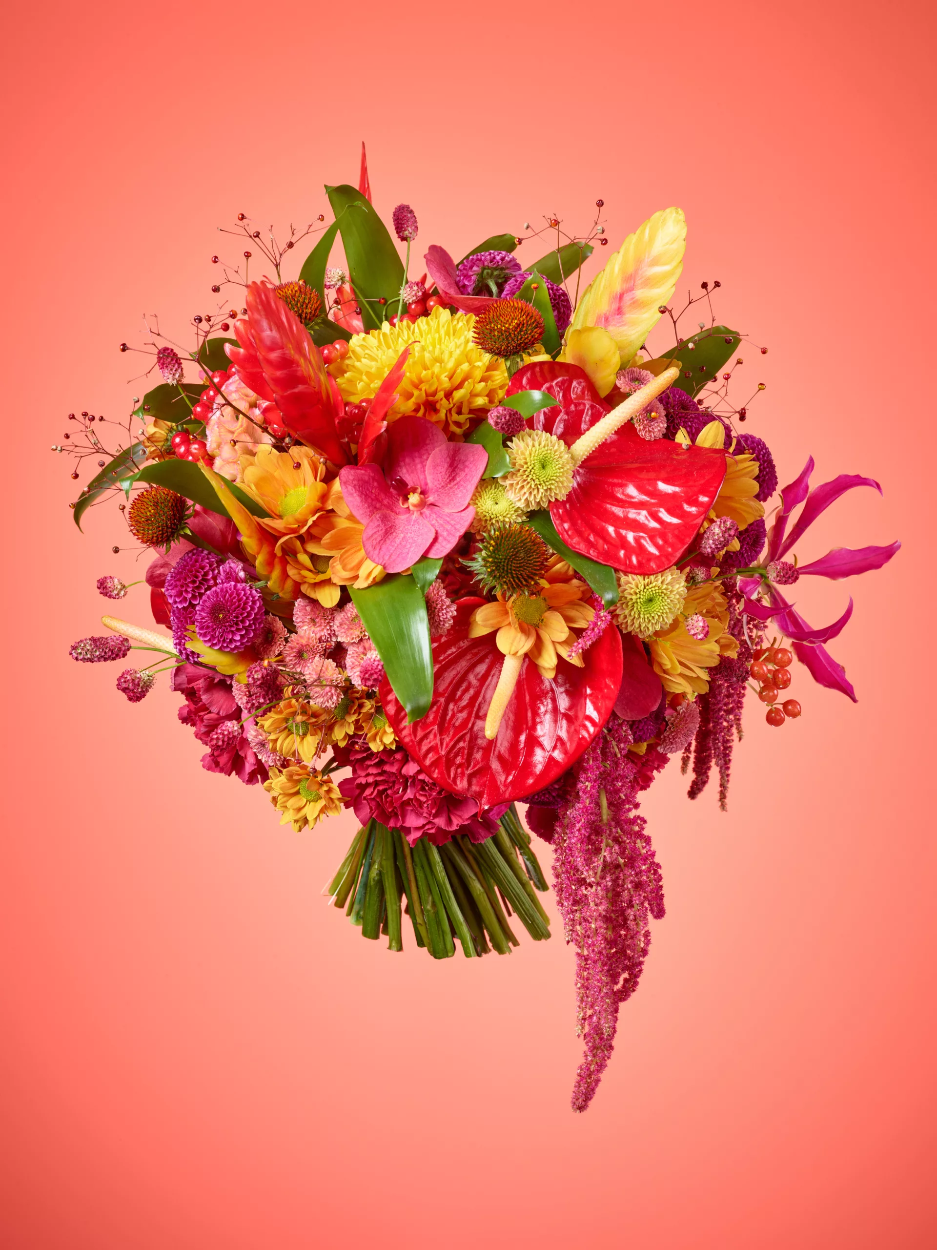 Ten intensywny, ekstrawagancki bukiet, wypełniony żywymi odcieniami czerwieni, emanuje pasją i miłością. Wydaje się być idealny dla pełnej temperamentu panny młodej, na wyjątkowe zaręczyny czy wraz z płomiennym wyznaniem uczuć. Chryzantemy, anturium, bromelie i orchidee tworzą pełny, wyrazisty look, subtelnie wzmocniony poprzez dodanie kilku eleganckich liści. Wystarczy powiedzieć „tak”.