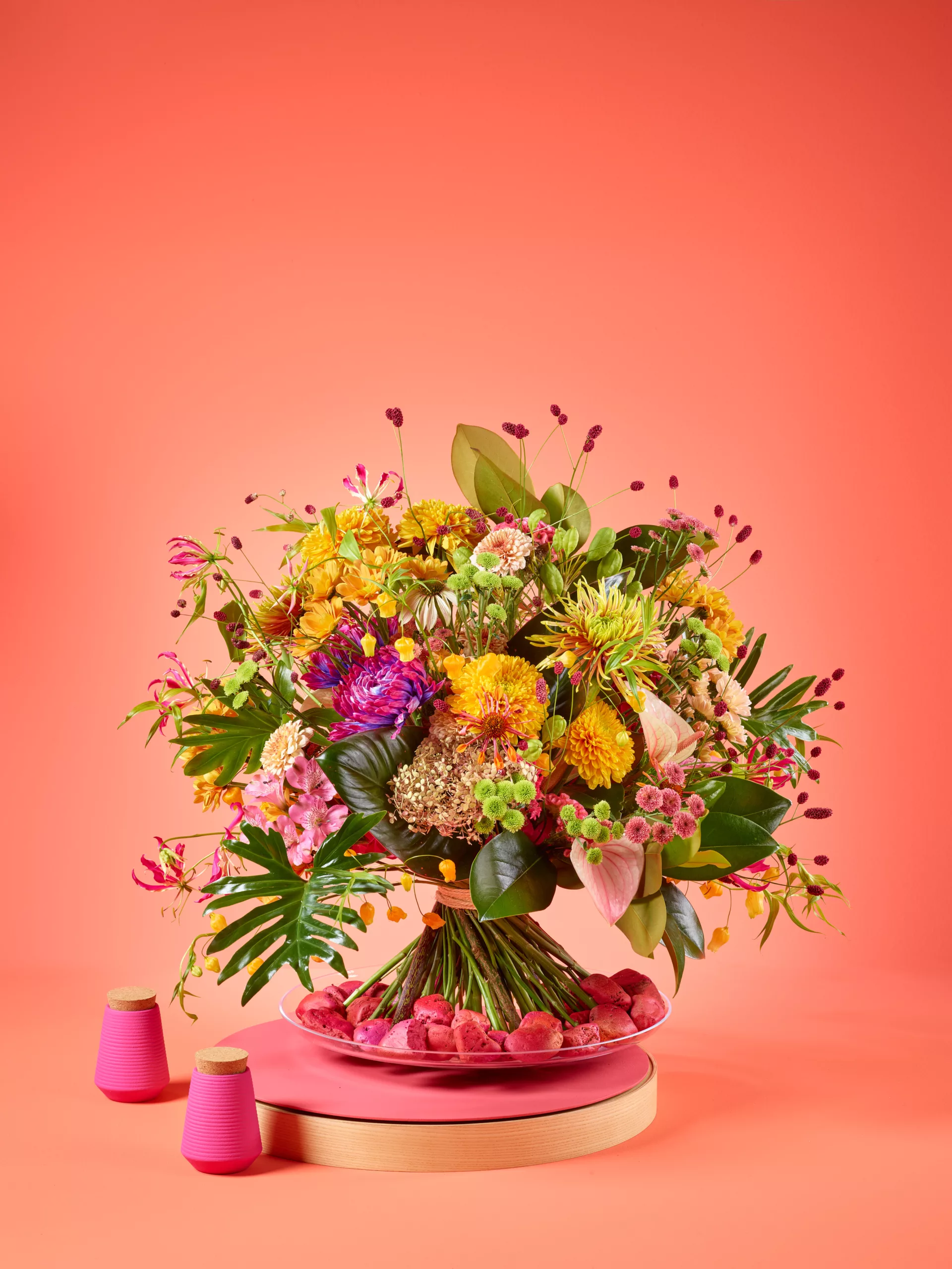 Bujne, wyraziste kwiaty i mocne kolory w zwartej obfitości. Ten intensywny, rozwibrowany kolorem bukiet, zgodny z trendem „W objęciach egzotyki”, wzmocni każde wyznanie miłości. Przyciąga wzrok i wydaje się być idealnym towarzyszem wyjątkowych chwil. Ta namiętna, kwiatowa obietnica to fantastyczny ambasador miłości!