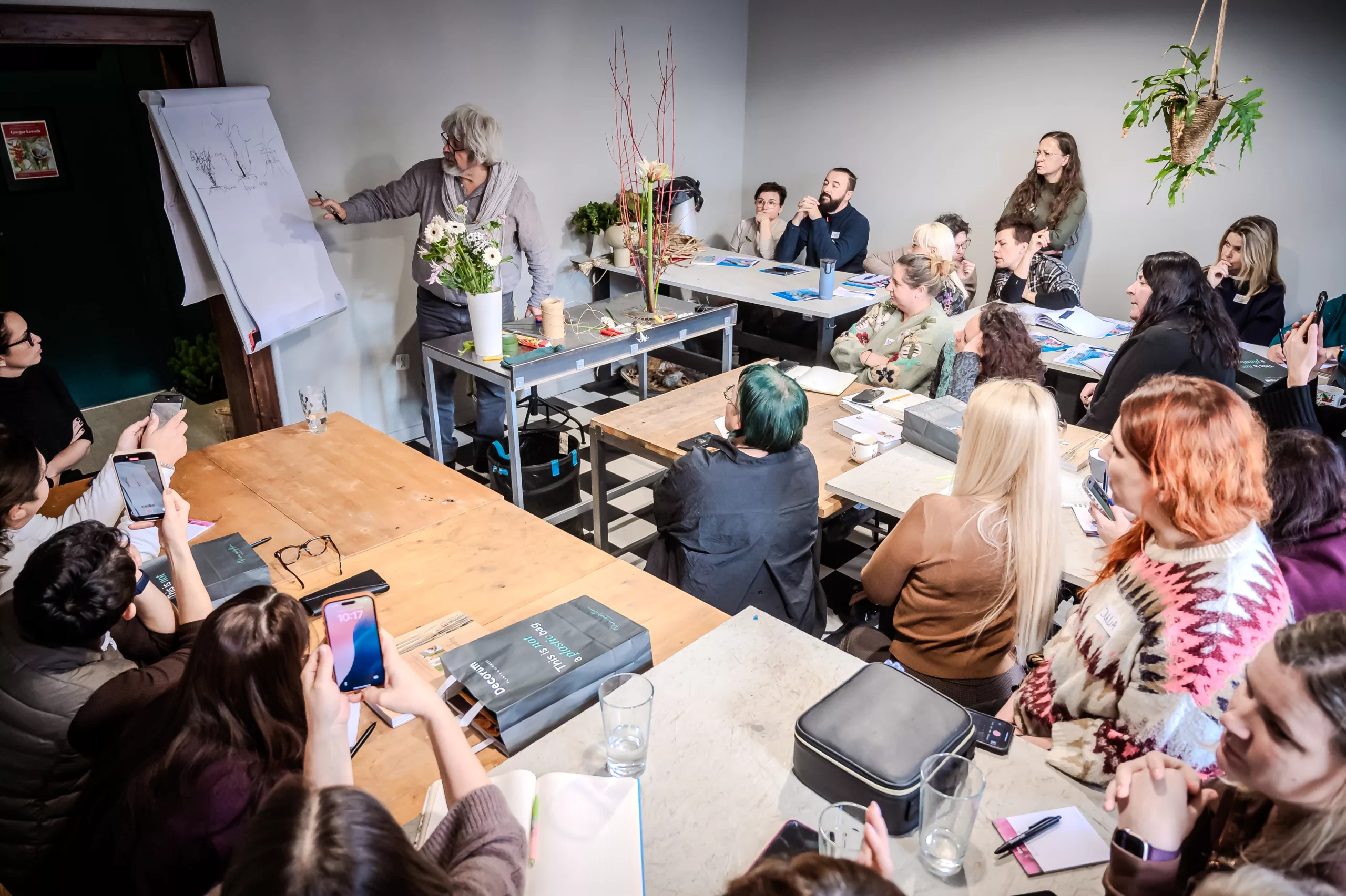 Uczestnicy pracowali praktycznie, tworząc własne projekty, a każda praca została szczegółowo omówiona przez Mistrza. Ten indywidualny feedback – spokojny, uważny i precyzyjny – był jednym z najcenniejszych elementów warsztatów.