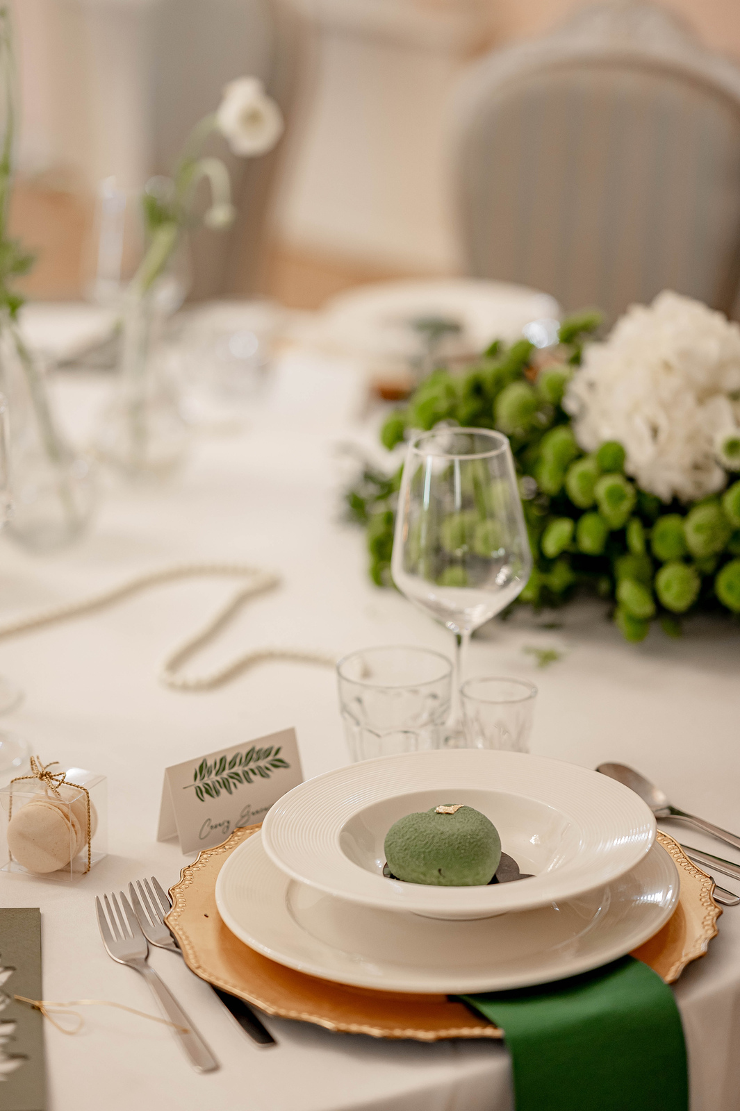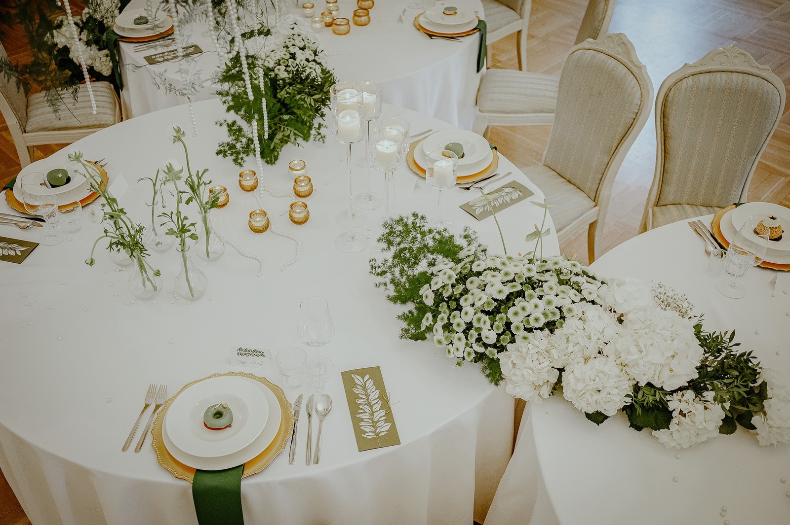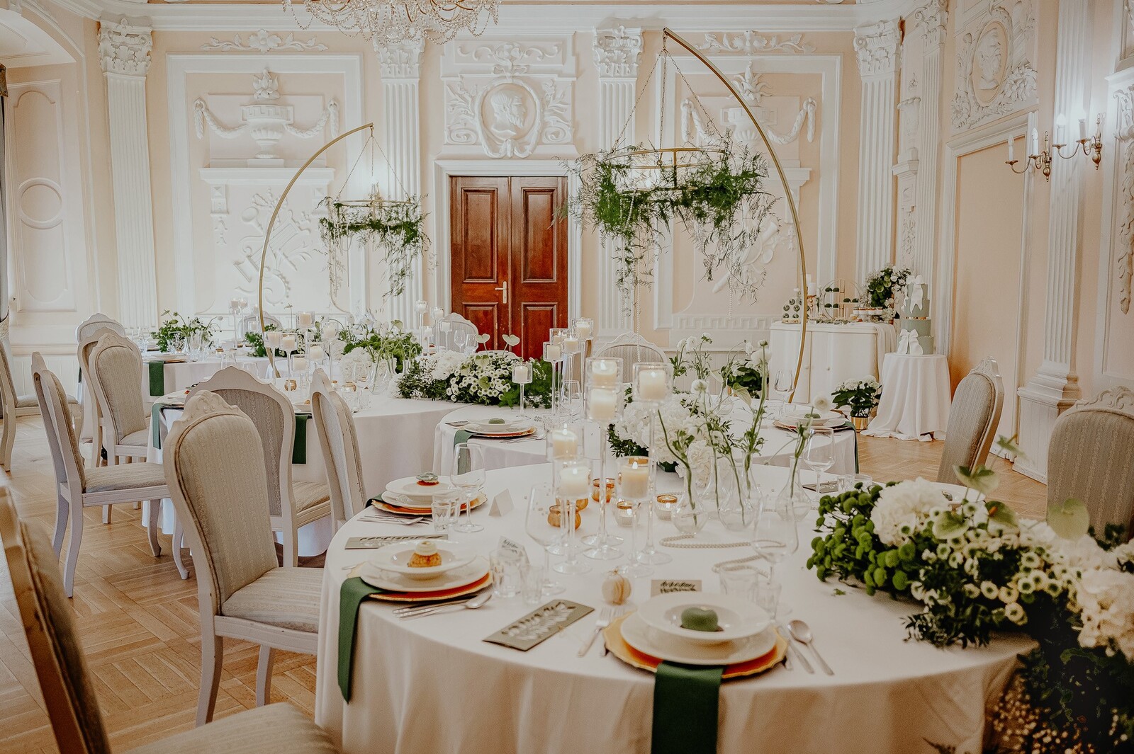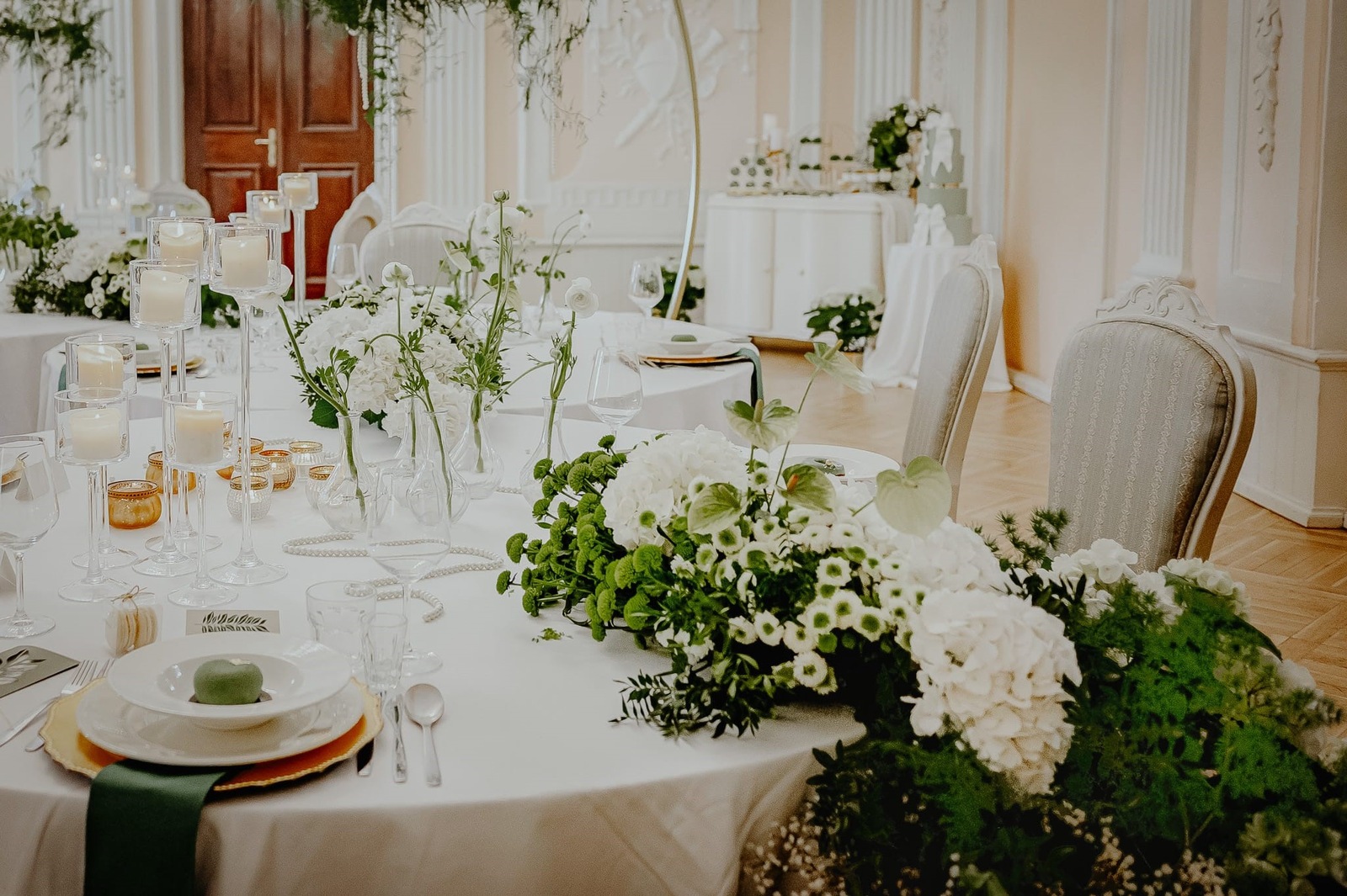 Dobór tych dwóch uniwersalnych barw sprawdzi się podczas uroczystości w stylu boho, greenery, glamour, klasycznym, leśnym, nowoczesnym, rustykalnym i wielu innych. W przedstawionej przez nas stylizacji biel i zieleń dopełnia złoto, co czyni ją nad wyraz elegancką.