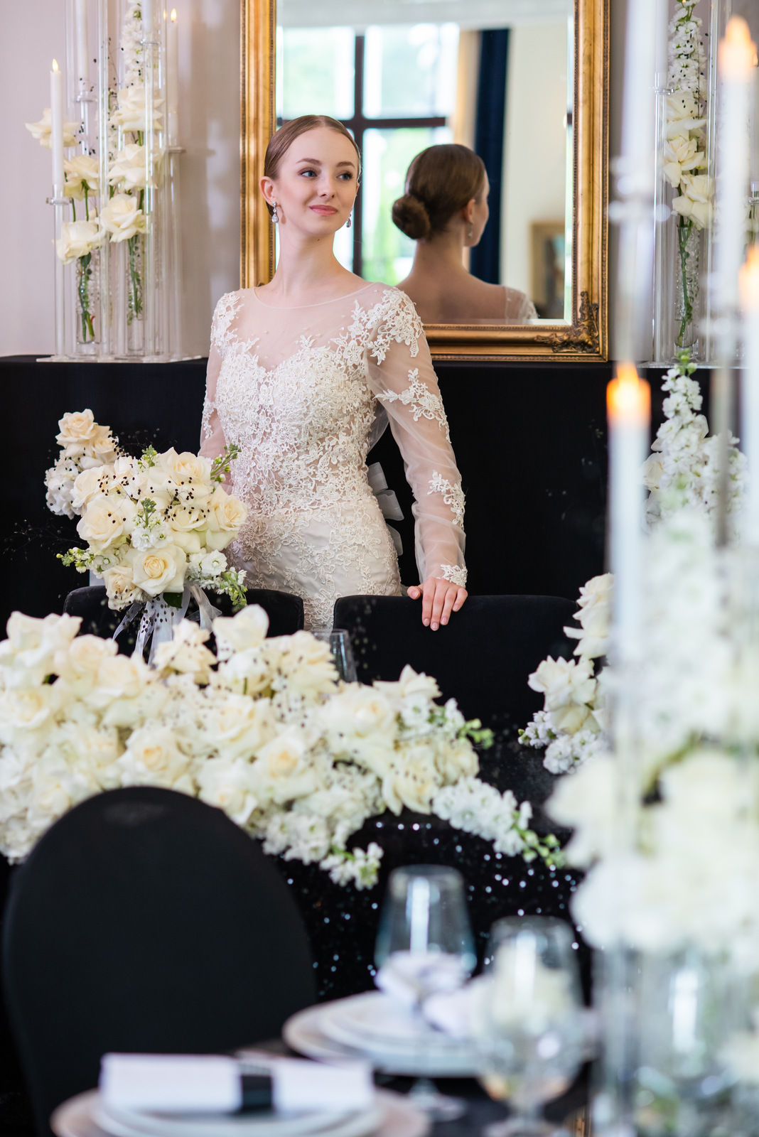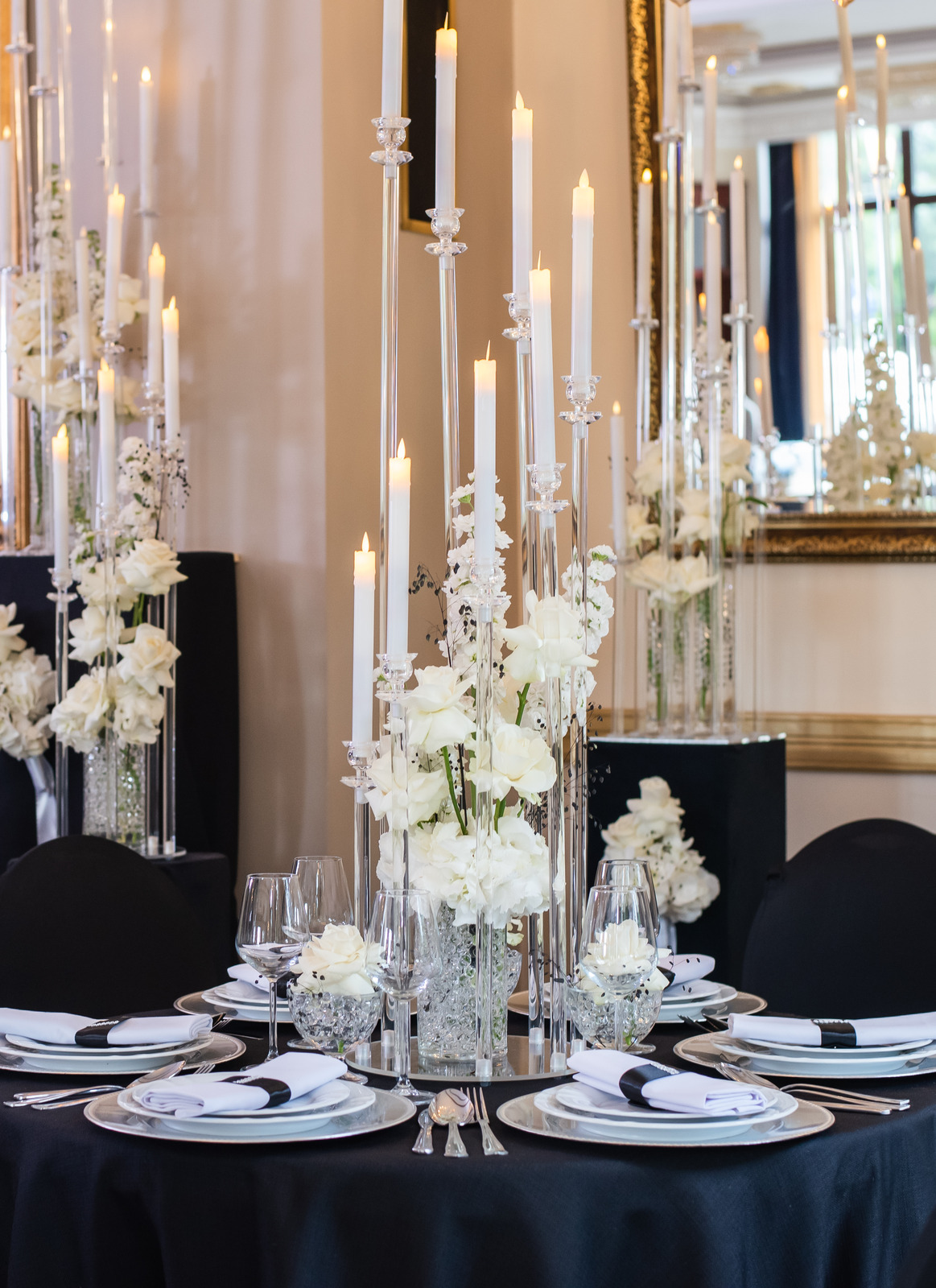 Kwestią wartą przypomnienia jest ślubna papeteria – zaproszenia, tablice powitalne, winietki i menu – również powinna zawierać kombinację czerni i bieli oraz motyw białego kwiatu. Na weselach black&white w dekoracjach stołów sprawdzają się czarne obrusy i pokrowce na krzesła. Na ich tle świetnie zaprezentuje się nieskazitelnie biała zastawa oraz szklane lub kryształowe postumenty, świeczniki i flakony, które podkreślą zjawiskowe piękno białych kwiatów. Wspaniały efekt można osiągnąć, zdobiąc białymi pąkami czarny tort oraz resztę słodyczy ze słodkiego bufetu.