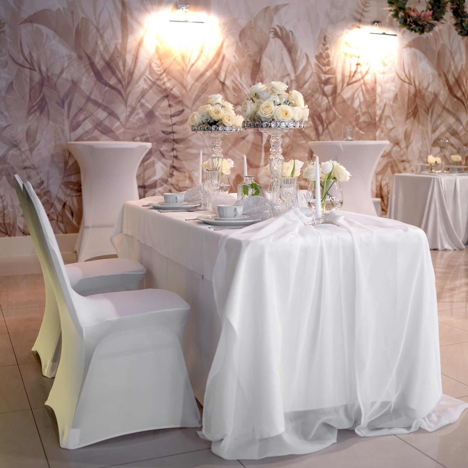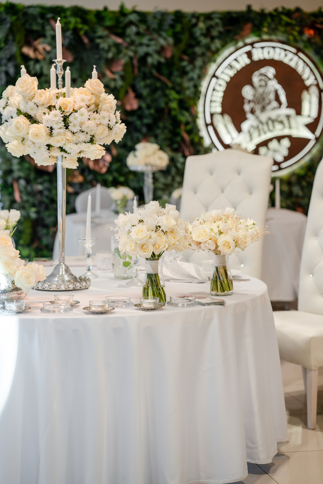 W bardziej tradycyjnej wersji białe obrusy może uzupełnić czarna zastawa, szkło i serwetki. Z kolei, gdy w dekoracjach zimowego wesela przeważać ma mroźna biel, idealne będą białe pikowane fotele i obrusy w tej samej tonacji, biała zastawa oraz kryształowe, srebrne bądź perłowe naczynia na kwiaty. W takim wydaniu białe kwiaty zyskają prawdziwie królewski wymiar.